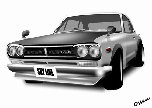 私が運転免許を取った20代の初めは、日産スカイラインのケンメリがはやっていました。ケンメリと言うのはコマーシャルでケンとメリーのスカイラインというフレーズで放映されていたので、これを略して「ケンメリ」と呼んでいました。友人が所有していたこの車で練習をさせてもらったのを覚えています。もう一人の友人がハコスカを持っていましたが、こちらは初心者には無理と言うことで運転させてもらえませんでした。ハコスカは箱型のスカイラインの略で、この形が気に入っていたのですが、最後まで運転させてもらえませんでしたが、よく乗せてもらったのを覚えています。日産車の形が好きだったのに、なぜかトヨタの販売会社に就職してしまっていました。そのころは金もなかったので中古車を探していたところ、出物でソレックスのキャブレター付きのコロナ2000GTのセダンタイプがあり、上司に買いたいと相談したのですが、そんな車で営業ができるかと却下され、しかたなく同タイプの2000EFIを購入したのでした。EFIとはElectronic Fuel Injectionの略で電子制御により、エンジンにガソリンを供給するシステムで、電子制御の走りみたいなものでした。と言うことで今回はコロナの画像がなかったので、ハコスカを描いてみました。